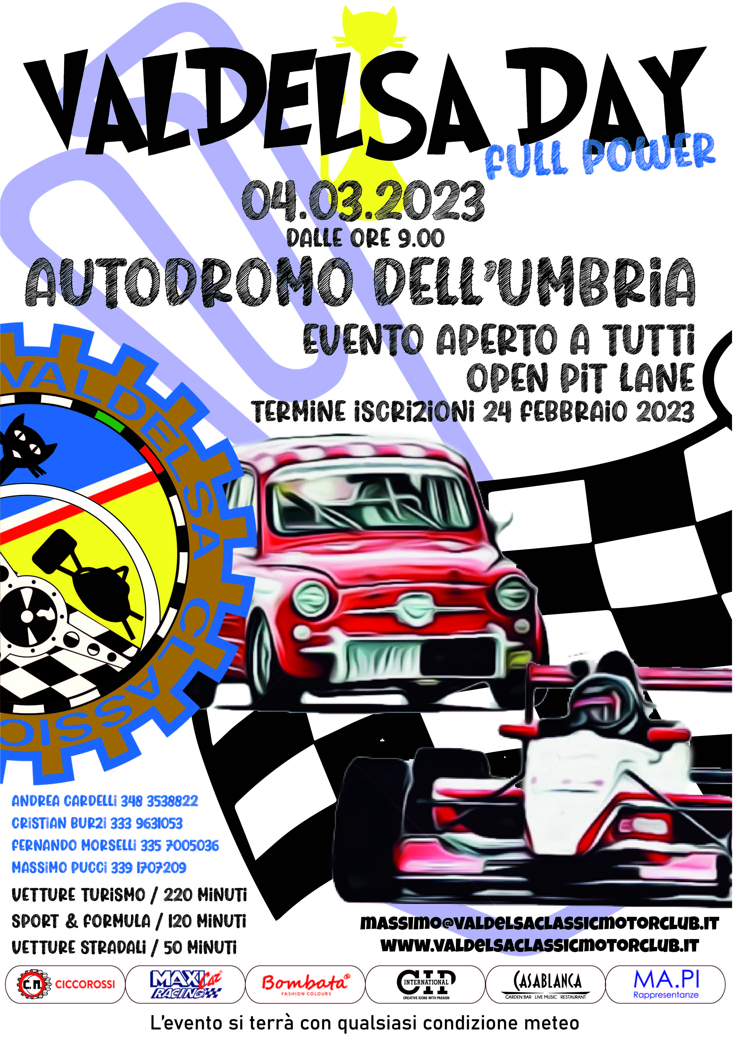EVENTO APERTO A TUTTI-OPEN PIT LANE: VETTURE TURISMO: 220 MINUTI SPORT E FORMULA: 120 MINUTI VETTURE STRADALI: 50 MINUTI