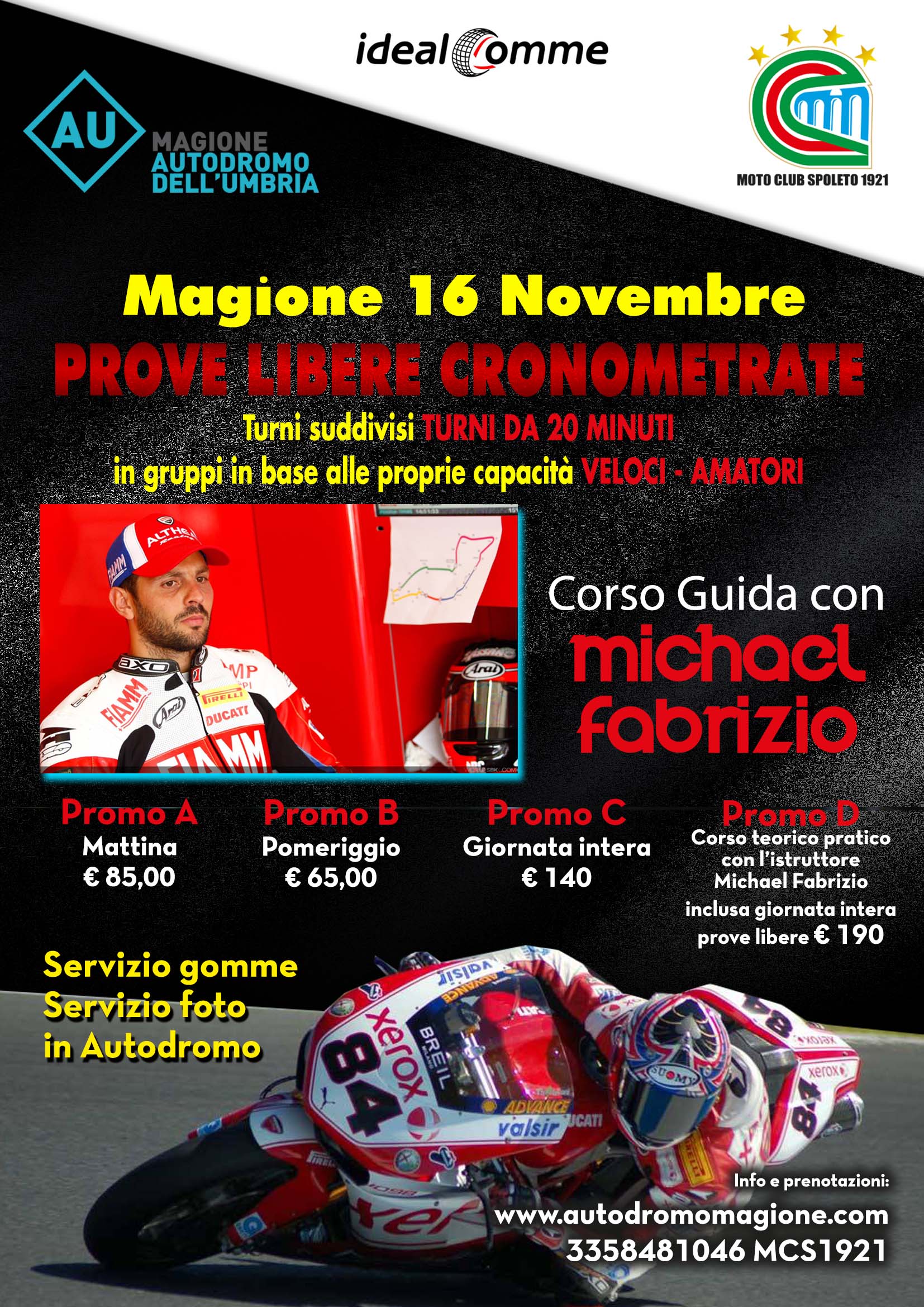 Il 16 novembre, nel corso delle sessioni libere cronometrate per moto, ci sarà la possibilità di partecipare ad un corso di guida con il pilota motociclistico Michael Fabrizio, protagonista di varie serie nazionali e internazionali.